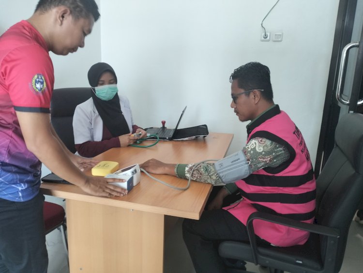 Ketua Bawaslu Mesuji, Deden Cahyono, dicek kesehatannya sebelum dikirim ke Rutan Way Huwi, Jum'at (24/10/2025) siang
